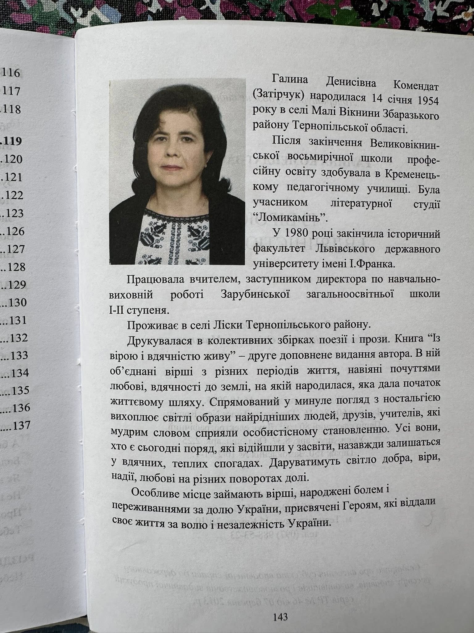 Щиро дякуємо авторці Галині Комендат-Затірчук за подаровану бібліотеці книгу «Із вірою і вдячністю живу». Це змістовна збірка поезії та прози, що складається з восьми розділів, кожен із яких відображає окремі теми та різні періоди життя. У ній — роздуми, спогади, переживання й цінності, близькі кожному.